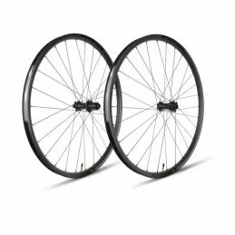 Ruedas MTB con llantas asimétricas de fibra de carbono y bujes straight pull.
